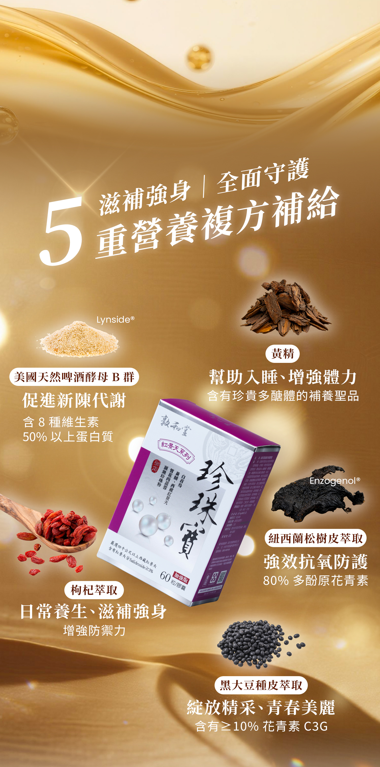 .嚴選紅景天萃取粉、松樹皮萃取物、黑大豆種皮萃取物