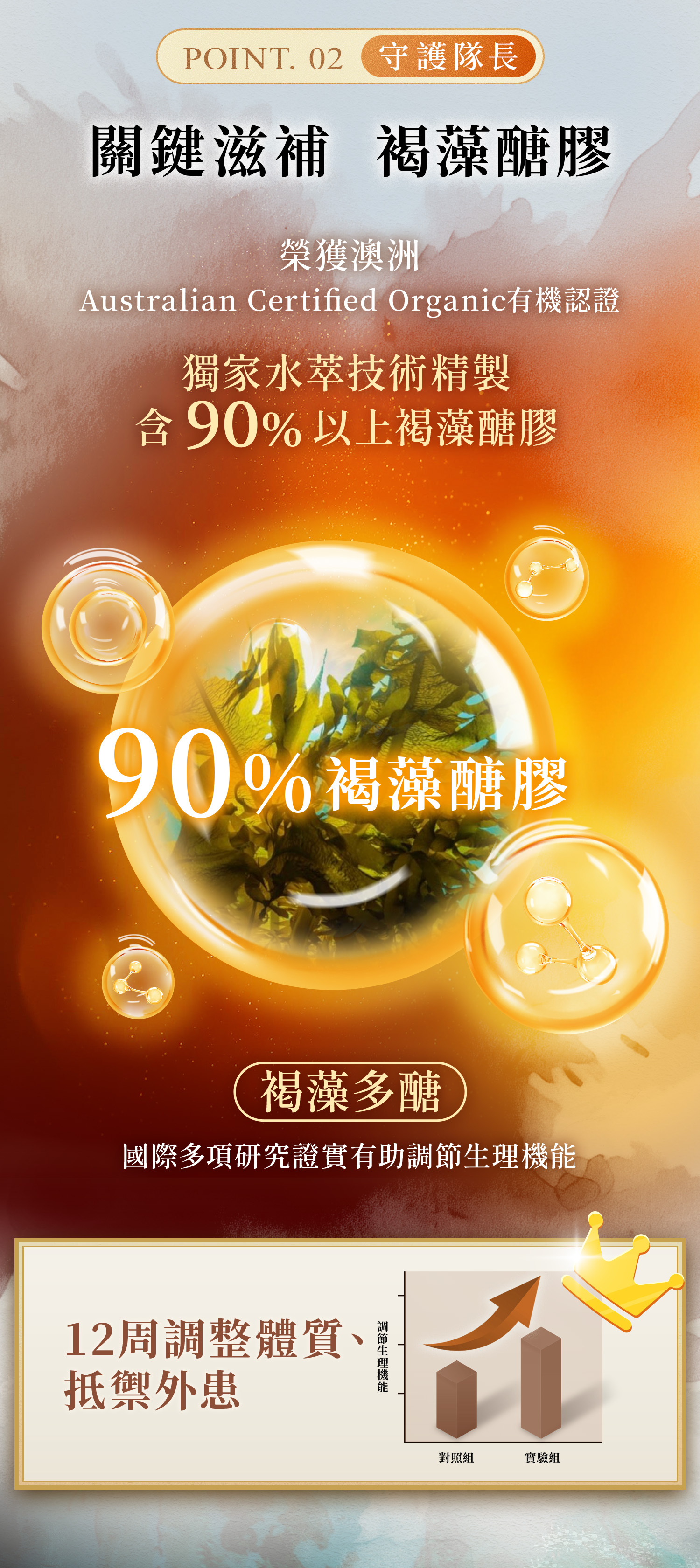 以獨家純水萃取技術精緻而得,活性成分和藻多醣超過90%